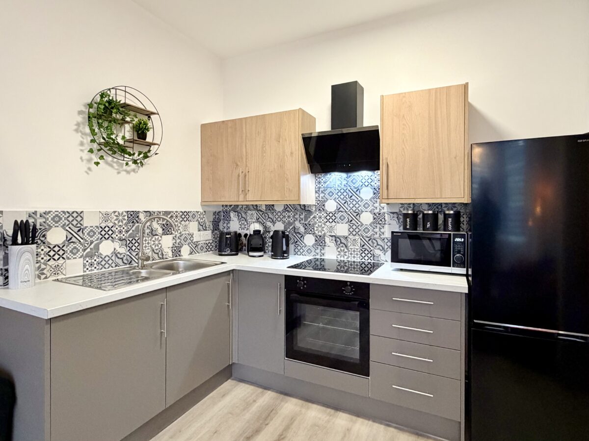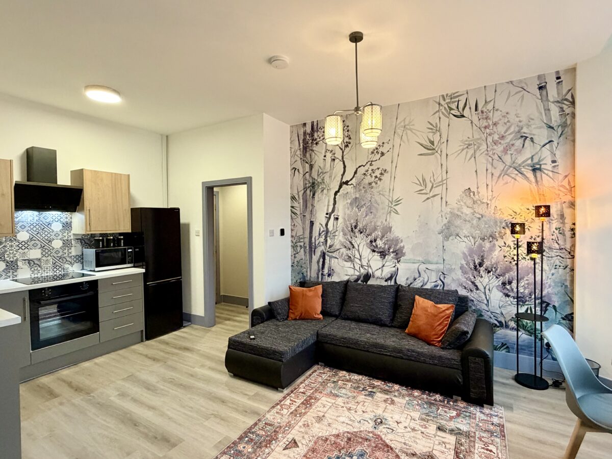Ideal for contractors, couples, or holidaymakers, the apartment features a bright open-plan living and dining area, a modern bathroom, and a fully equipped kitchen with oven, hob, microwave, coffee machine, and washing machine.